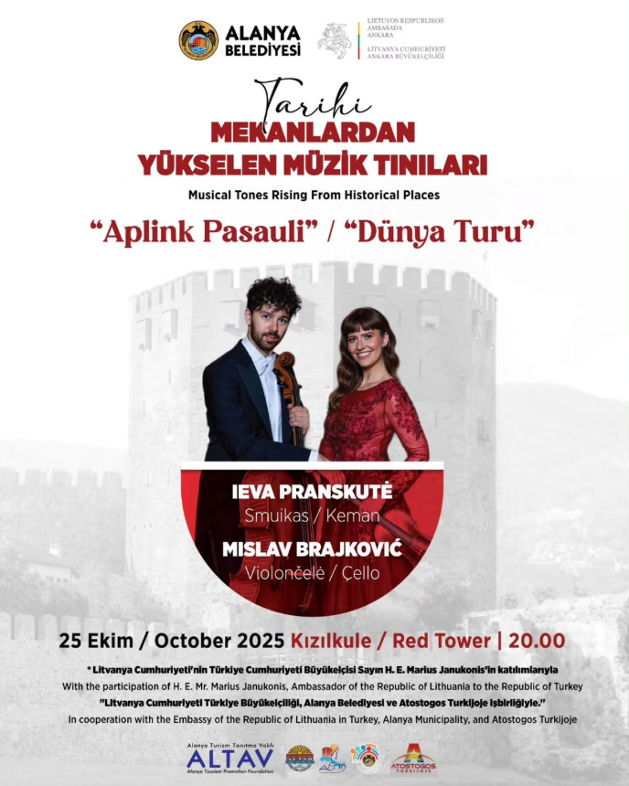 Organized by Alanya Municipality in collaboration with the Embassy of the Republic of Lithuania in Ankara, and supported by Atostogos Turkijoje and Anjeliq Downtown Boutique Hotel, the concert series “Musical Echoes Rising from Historical Venues” meets music lovers at the Red Tower.