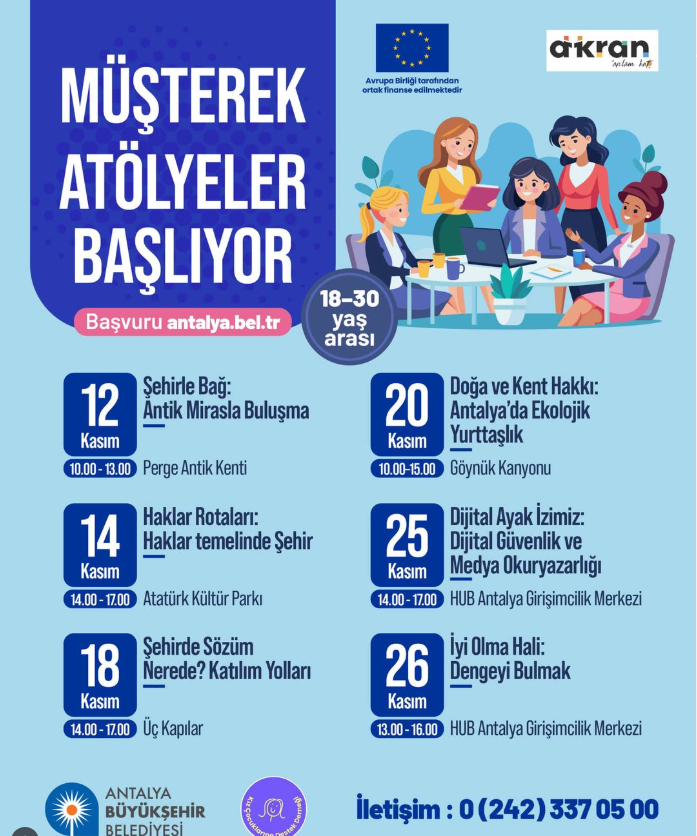Если вам от 18 до 30 лет и вы молодая женщина, вы можете получить новый опыт в области города, природы, цифрового мира и культуры участия, присоединившись к мастер-классам, которые проводятся в разных районах Антальи, и внести вклад в усиление голоса молодых женщин в городе.