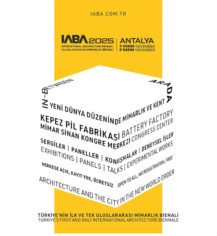 IABA 2025 — первая и единственная Международная архитектурная биеннале в Турции, которая пройдет в Анталье с 3 по 9 ноября 2025 года. В течение биеннале вас ждут выставки, панели, выступления и экспериментальные работы на тему «Архитектура и город в новом мировом порядке».